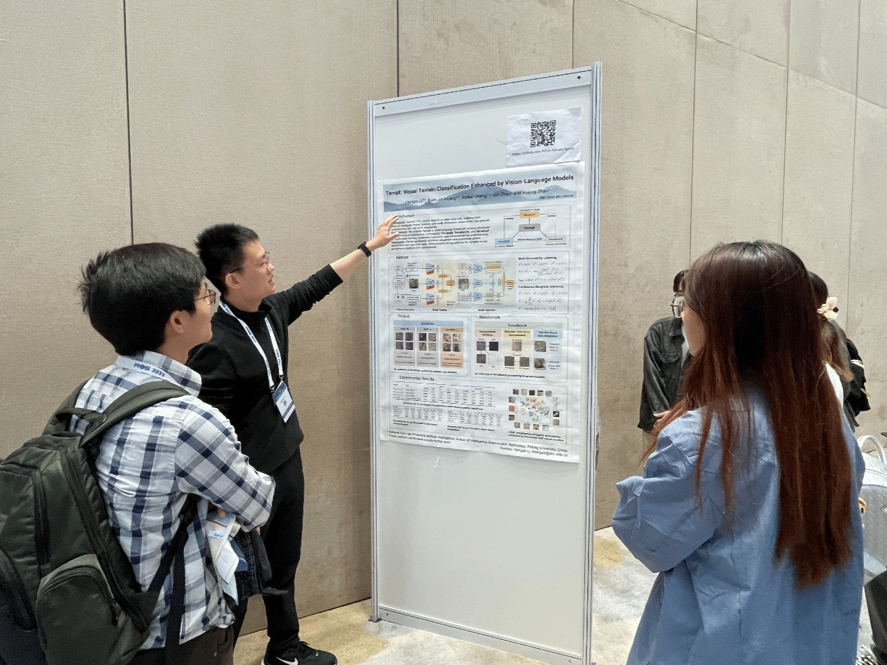 习总书记在党的二十大报告指出,要加快实现高水平科技自立自强,以国家战略需求为导向,集聚力量进行原创性引领性科技攻关。作为智能学科的博士生,李鸿泽深知将论文写在祖国大地上,解决实际应用中的“卡脖子”难题,是新时代青年的使命与责任。目前,移动机器人应用已逐渐从城市道路等结构化场景向草原、山地等非结构化越野场景拓展。如何在极端天气和复杂地形下,实现对地表属性的准确理解,是保障机器人平台安全可靠运行的关键,也是制约我国特种车辆自主机动的技术瓶颈之一。面对这一挑战,李鸿泽在赵卉菁教授指导下,选择了目前研究仍不完善的地表属性分类任务作为主攻方向。针对该任务中存在的模型泛化性低、数据标注成本高等痛点,他提出一种视觉语言学习范式,填充该领域在数据集、评测基准、分类模型方面的空白。在此基础上,李鸿泽研发了半监督视觉-机体感知融合分类框架,在各项评测基准上大幅超越现有方法,并通过实机部署验证了其能显著提升机器人在黑暗、恶劣天气下的感知鲁棒性,为各式移动机器人在复杂越野场景实现安全稳定的行驶提供坚实基础。